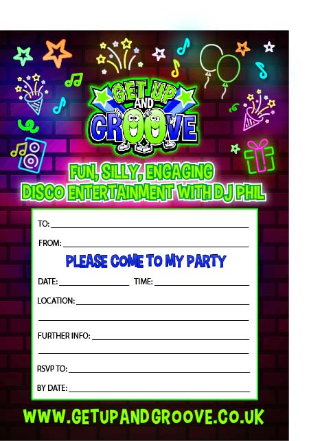 You can give me a call on 07704 517884 or visit Contact Me to find out more. Use these downloadable party invitations to invite people to your child's mobile disco party in Dorset!